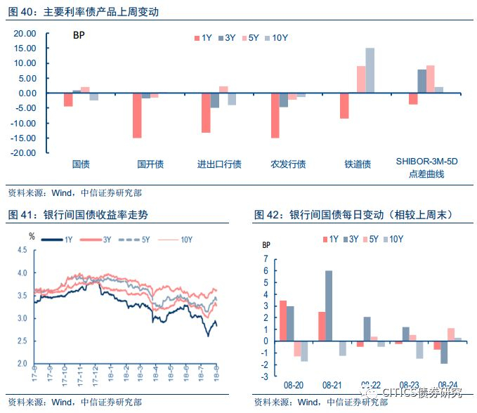 银行间质押回购加权利率涨跌互现。8月24日,DR001加权平均利率为2.4088%,较前一周下降21.66BP;DR007加权平均利率为2.5739%,较前一周下降13BP;DR014加权平均利率为2.8831%,较前一周上升13.53BP;DR021加权平均利率为2.8000%,较前一周下降7.43BP;DR1M加权平均利率为2.8866%,较前一周上升20.5BP。截至8月24日,SHIBOR方面,隔夜、7天、两周、1个月、3个月分别变动-18.8BP、-3.8BP、14.3BP、8.5BP、7.2BP至2.3920%、2.6120%、2.7480%、2.7380%、2.8890%。上周,DR007的偏离度在0至0.1之间波动,偏离度有下行趋势,预计本周央行仍然以净投放为主。