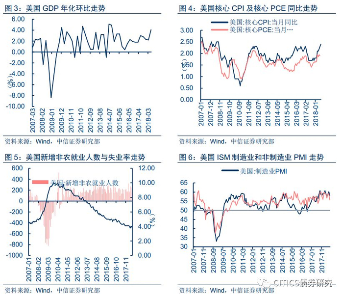 美国经济基本面表现强劲,失业率屡创新低,薪资增速上行,通胀压力将推动美联储逐渐加息。从经济的基本面来看,自2009年起,美国进入了金融危机之后的经济复苏阶段,GDP方面,自2009年复苏以来美国GDP增速在1%-4%区间附近震荡,中间受美联储退出量化宽松政策和加息等的影响,GDP增速有一定放缓,近期受益于PCE以及出口加速增长,2018年二季度实际GDP年化季环比初值为4.1%,创近四年最高增速,并使美国GDP上半年增速达到3%,GDP表现强劲;通货膨胀方面,自2009年经济复苏起,通胀先抑后扬,2015年以来美国消费者物价指数CPI和个人消费支出指数PCE同步走高,2018年PCE同比涨幅已连续四个月超过2%,6月核心PCE同比增长1.9%,较上月有所回落,7月CPI同比增长2.9%,核心CPI同比增长2.4%,超过市场预期,紧缩的劳动力市场和原材料成本的上涨将推动通胀上升,从而推动美联储逐步加息;就业方面,美国失业率屡创新低,7月失业率为3.9%,新增非农就业人数低于预期,为15.7万人,增速有所放缓,平均时薪较6月上涨7美分,为27.05美元,工人紧缺、失业率的降低推动工资水平高的上涨,同时为通胀也带来一定压力,就业形势仍然强劲。同时,美国制造业与非制造业PMI均位于荣枯线之上,固定投资增速有所回升。