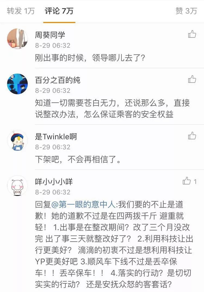 3. 顺风车业务模式重新评估,在安全保护措施没有获得用户认可之前,无限期下线;
