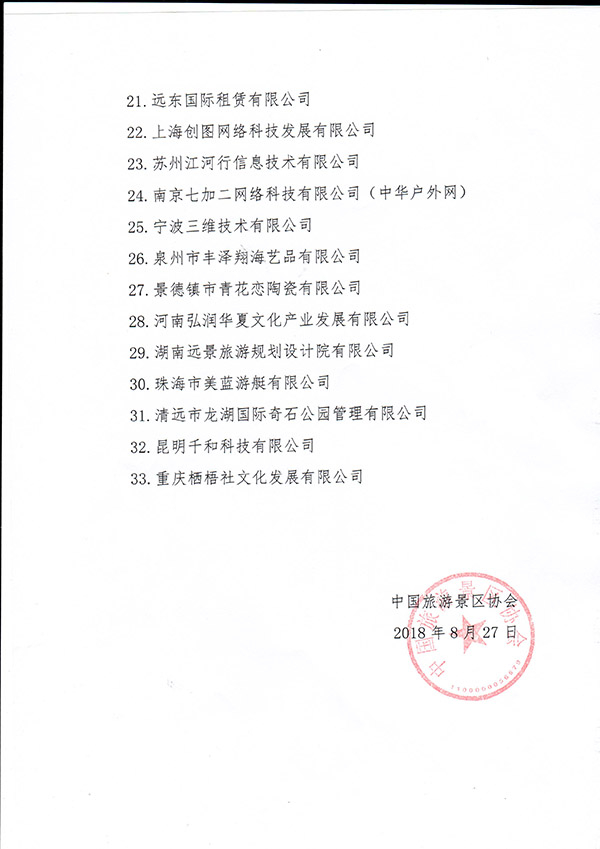 新华社8月28日消息,据中国旅游景区协会消息,依据《中国旅游景区协会章程》有关制度规定,结合协会发展的实际需求,贵阳青岩古镇景区管理有限公司、辽宁千山旅游集团有限公司、宁夏水洞沟旅游开发有限公司等54家企事业单位获中国旅游景区协会会员资格。同时,因未能履行会员义务,红伟邦达(北京)工艺品有限公司、去哪儿网(北京趣拿软件科技有限公司)等33家单位被取消会员资格。具体名单如下: