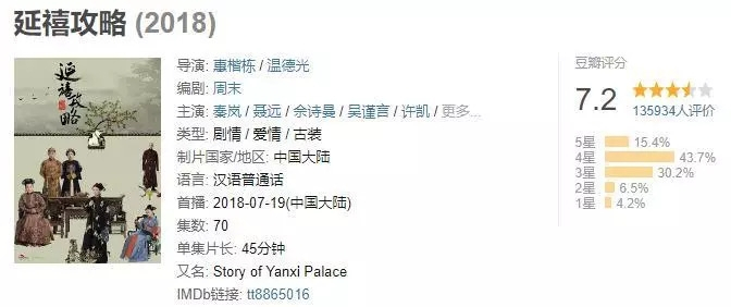 8月26日晚《延禧攻略》大结局,平台播放量已经超过了136亿,豆瓣上的评分也从7.1涨到了7.2。