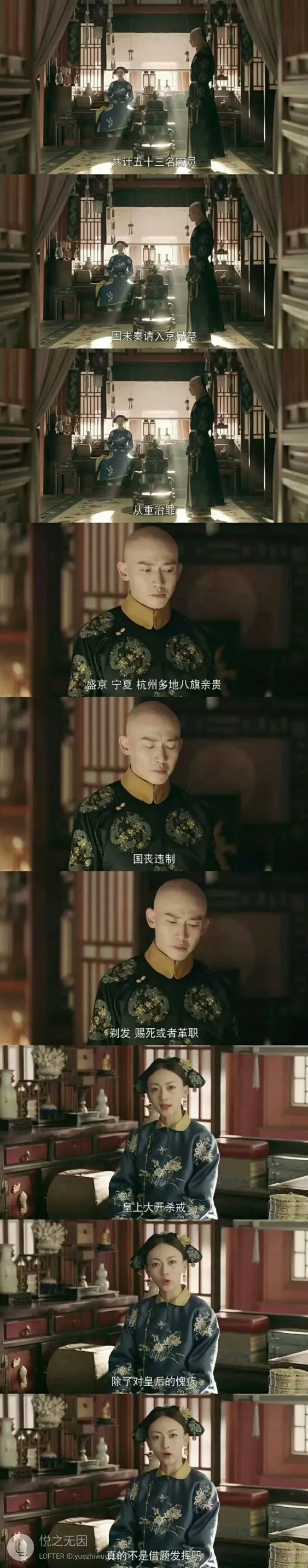 用魏璎珞和乾隆决裂那一场戏,从魏璎珞的口中说出了乾隆十三年借孝贤皇后的死引发的全国的“剃发案”。至此之后,乾隆更加独断专权。