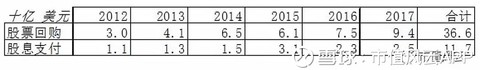 而从公开信息来看,仅自2012年以来,公司各年进行股票回购和支付股息的支出就达到了483亿美元,其中2017年的股票回购耗资达到94亿美元。