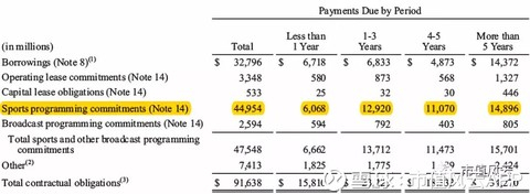 回到迪士尼身上,公司最大的合约负债为体育节目合约,达到450亿美元,占全部合约负债的49%。