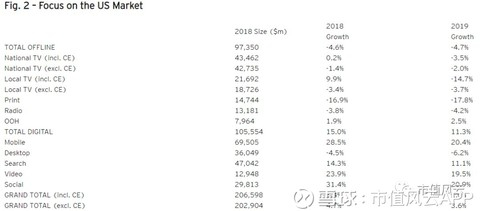 根据麦格纳环球公司(Magna Global)的预测,美国2018年广告市场增速将达到6.4%。如果剔除周期性事件(cyclical events),如中期选举、世界杯、冬奥会等,那么增速为4.7%。