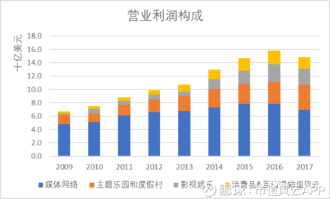 从2009年起算,公司收入CAGR为5.4%,其中增长较快的板块为主题乐园与度假村,CAGR为7.0%,而影视娱乐增长较慢,CAGR为4.1%,另外,媒体网络增速为4.8%,消费品及互动媒体的增速为5.6%。