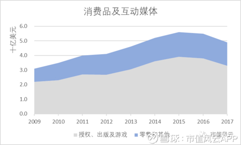财务表现方面,从2015年开始,该板块收入持续下滑。2017年,授权、出版及游戏业务收入33亿美元,同比下滑15%,零售及其他业务收入16亿美元,同比下降8%。
