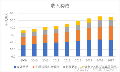 以2017年为例,公司总收入为551亿美元,与上年相比基本持平。其中,媒体网络收入235亿美元,占比43%;主题乐园和度假村收入184亿美元,占比33%;影视娱乐收入84亿美元,占比15%;消费品和互动媒体收入48亿美元,占比9%。