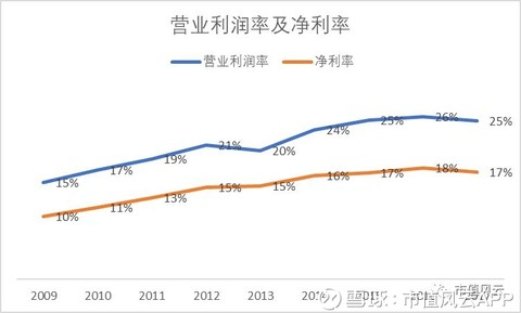公司利润率在过去9年整体趋势向上:营业利润率从2009年的15%增长到2017年的25%,净利率从2009年的10%增长到2017年的17%。虽然2017年同比降低1个百分比,但是仍处于高位,盈利能力优秀。