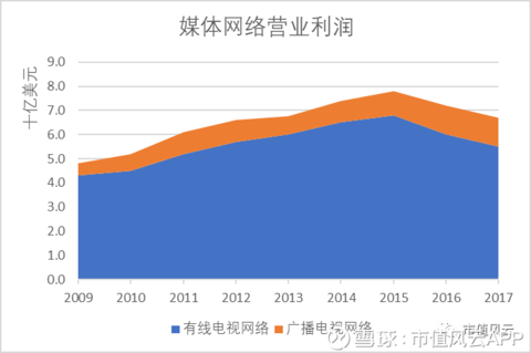 有线电视网络自2015年起出现了营业利润下滑,2015-17的营业利润分别为68亿、60亿、55亿,更进一步凸显了公司该板块的主要利润来源正在面临挑战,传统的多频道视频节目分发模式已经不足以支撑公司媒体网络业务的持续增长。