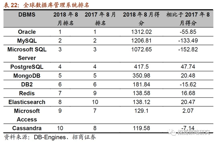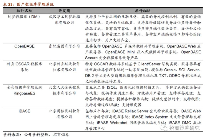 ⚑ 数据库管理系统:目前全世界最流行的两种DBMS是甲骨文公司旗下的Oracle和MySQL,中国数据库厂商大多基于开源数据库引擎开发或基于成熟数据库源码进行自主研发。总体看,国产数据库产品已经取得了明显进展。相关上市公司:东软集团等。