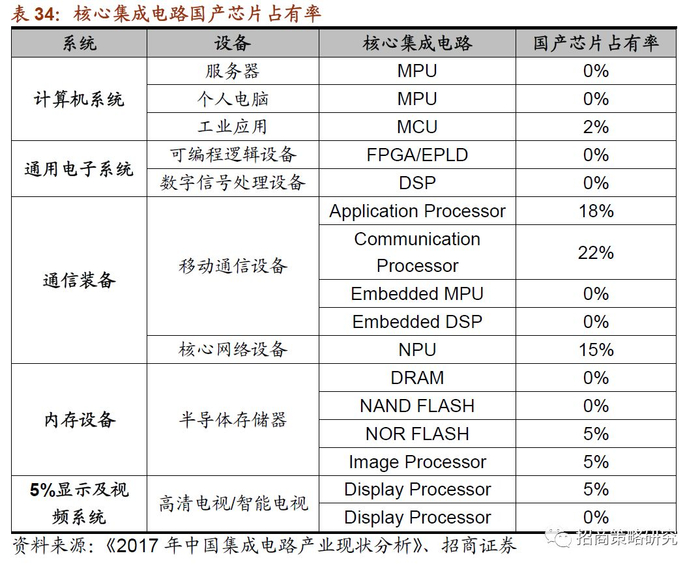 并且,目前我国核心集成电路的国产芯片占有率整体较低,除了移动通信终端和核心网络设备有部分集成电路产品占有率超过10%外,包括计算机系统、通用电子系统、显示及视频系统中的核心集成电路国产芯片占有率都是0。芯片产业链包括装备、材料、设计、制造、封装测试五个环节。在装备与材料方面,中国与国际顶尖水平差距较大。而封测领域,中国芯片封装企业长电科技已经跻身世界第三。因此,加大力度投入在在芯片设计与制造两大环节可以带动产业链的前后两端。设计与制造环节目前也是中国芯片产业投资和政府扶持的重点。