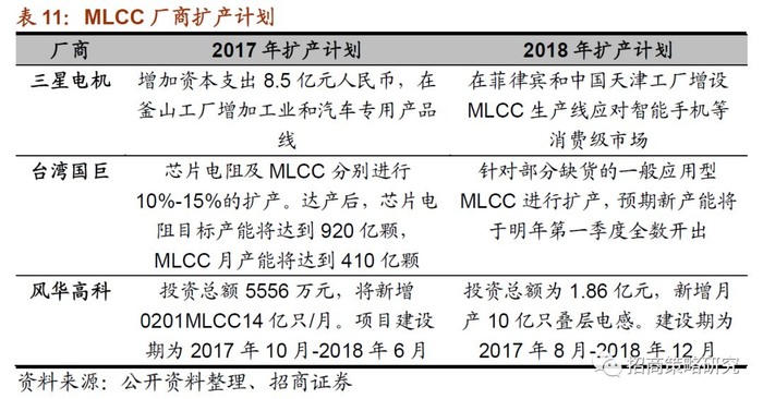 由于日本厂商在行业内的龙头地位,日本厂商的产能调整对市场供需会产生很大的影响。2018年2月初日本大厂京瓷宣布将于2月底停产0402、0603尺寸的104、105规格MLCC,国巨便从4月1日起调涨全系列MLCC价格,平均调涨幅度落在40~50%,高于2月份的10~20%,等于调涨幅度较2月提升2~2.5倍。三星电机、国巨、风华高科等MLCC厂商纷纷表示扩产意向。但是市占率高达60%的日系大厂,则没有扩产计划。被动元件制造公司业绩大增,今年一季度,主营被动元器件的相关上市公司业绩增长强势。国巨2018年一季度净利润10.35亿元,同比增长486.36%;华新科一季度净利润2.92亿元,同比增长240.09%;风华高科一季度归母净利润约1.16亿元,同比增长327.69%。