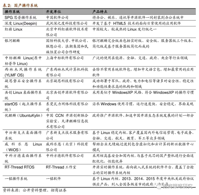 ⚑ 操作系统:移动操作系统17年安卓市占85.9%/IOS14%。PC操作系统同样是寡头垄断(2017年Windows市占率达91.41%)。国内中标软件旗下的中标麒麟操作系统申威版、龙芯版等自主可控产品已非常成熟。相关上市公司:中国软件等。
