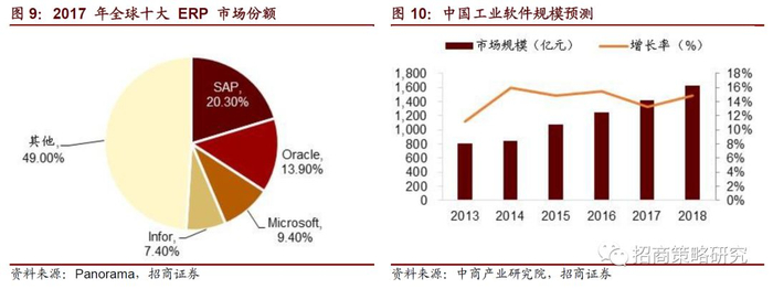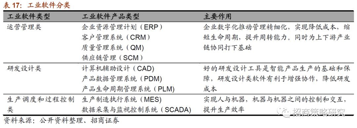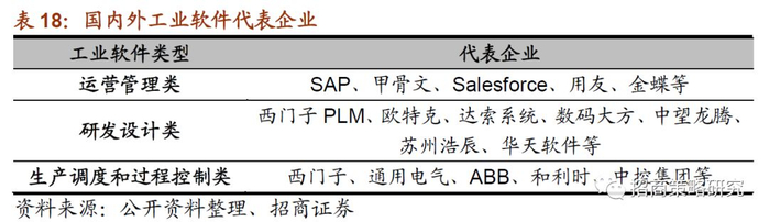 ⚑ 工业软件:研发设计类、生产控制类被外资企业占据主导,信息管理类目前处于群雄割据。国内市场80%的设计软件、50%的制造软件等为国外品牌占领,但也涌现出了一些优秀的工业软件企业。相关上市公司:用友网络等。