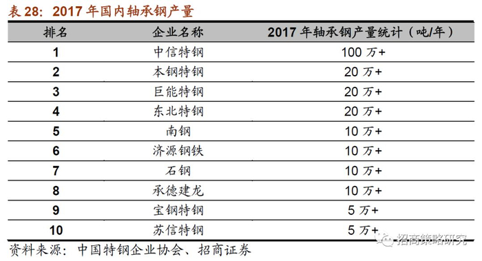 2017年国内轴承钢品种产量总计达到300万吨以上,国内各钢厂在轴承钢品种方面产量差距也相对较大,前三名的中信特钢、东北特钢、巨能特钢的产量之和占国内总产量近60%的份额。国内高端轴承钢技术近日也取得了最新的突破。2018年7月,西王特钢首批高端稀土轴承钢顺利生产下线,技术性能达到了国际先进水平,产品品质超过了美国、欧洲相关标准,解决高端轴承钢技术“卡脖子”难题指日可待。