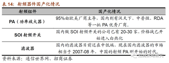 2018年射频芯片市场可达150亿美元,而高端市场基本被Skyworks、Qorvo和博通3家垄断,高通也占一席之地。国货只能卖给一些小品牌手机,且多为2G、3G芯片,4G射频芯片基本依赖进口。手机上的射频芯片占整个线路板面积的30%~40%。目前手机中所有核心器件都完成了国产化,只有射频器件仍然95%由欧美厂商主导,尚未有亚洲厂商可以进入市场。但是国内在军工等方面的射频本身已经存在一些积累,近几年国内射频的公司也取得了很大的突破。一些有历史背景的公司如德清华莹、好达等产品在手机品牌客户加速认证,一些有海外经历的创业公司如 Vanchip、卓胜微、瑞宏和瑞石等也取得了非常快速的成长。未来几年在switch、saw filter、PA 和上游晶体材料上面将持续推进国产化替代,相应的A股上市公司信维通信、天通股份和三安光电等标的将持续受益。