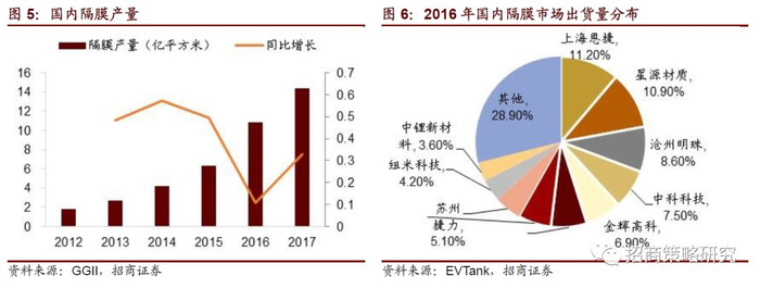 目前,锂电池四大核心材料中,正、负极材料、电解液都已实现了国产化,而隔膜仍是短板,国产化率较低,隔膜是锂电池原材料中技术壁垒最高的部分。国内锂电池企业众多,未来进入国际市场,面对国际巨头竞争,缺乏核心专利和材料技术是中国电池企业未来最大的隐忧和短板。国产隔膜主要供应低端3C类电池市场,而高端隔膜仍然依然大量依赖进口。干法隔膜技术比较成熟,国产干法隔膜基本能够完全替代进口产品,而在湿法隔膜领域国内还处于进口替代的前期。同时,国内对隔膜需求量增长速度较快,也会带动国内企业技术进步及产能扩张。2017年,我国隔膜产量14.4亿平方米,同比增长33%,自2012年到2017年,国内隔膜产量年复合增长率达到68%。