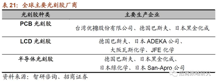 PCB光刻胶:自2002年起,我国逐渐从 PCB 光刻胶进口大国转变为PCB 出口大国。2015年我国PCB光刻胶产值达12.6亿美元,占全球市场份额高达70%。在PCB领域,干膜已被外资把控,油墨部分已有国产替代,进口替代率达到46%,容大感光、广信材料等公司是主要参与者。