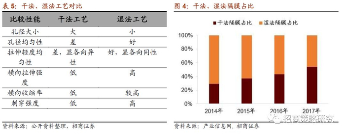 制备锂电池隔膜有干法和湿法两种工艺,干法隔膜和湿法隔膜各有优缺点,干法隔膜在生产工艺、成本、环保经济等方面具有较大优势,湿法隔膜则具有短路率低、孔隙率和透气性可控范围大等优点。目前市场的应用中,从全球锂电池企业的选择来看,干法隔膜和湿法隔膜并存,但近年来随着三元锂电池占比的提高,湿法隔膜产量的占比也稳步提升。2017年国内湿法隔膜产量达到8.06亿平方米,占比56%,超过干法隔膜。