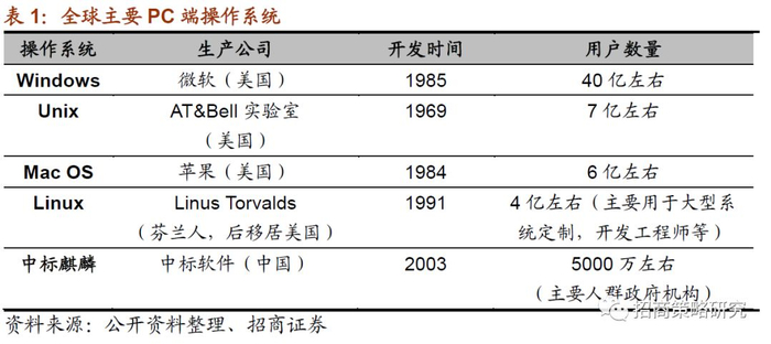 PC操作系统市场同样是以微软、苹果等美国公司为主的寡头垄断市场。自从1985年微软发布第一代操作系统Windows 1.0,微软的Windows操作系统一直占据PC操作系统市场龙头位置长达三十余年,2017年Windows操作系统的市场占有率高达91.41%。其他PC操作系统包括Linux、Unix、ChromeOS等市场份额较小。Linux操作系统的内核源代码可以自由传播,当前主要用于服务器,2017年市占率为2.27%;Unix操作系统大多是在多处理器架构下运行,常用于学校的工作站。国产操作系统深度、普华、中标麒麟、红旗等都是在Linux的基础上二次开发出来的操作系统。