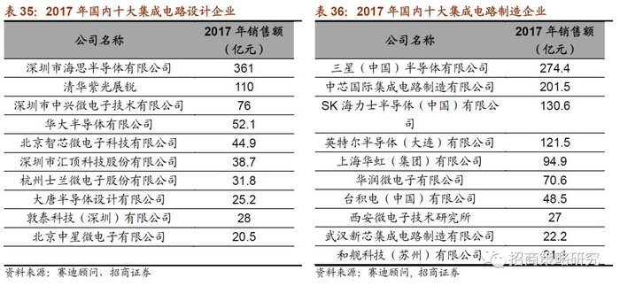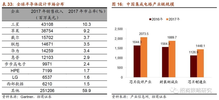 芯片设计处于集成电路产业链的上游,在整个芯片制造领域中比较重要。PC机时代英特尔、AMD等芯片巨头垄断了PC的芯片市场,因此在PC领域国产芯片无法和美国竞争。而随着电信业的发展,通信设备制造产业的崛起却带给中国芯片产业前所未有的机遇。华为海思、中兴微电子、大唐都成为中国最大的芯片厂家之一。中国本土手机厂家和平板电脑厂家的崛起使得展讯、全志、瑞芯微等公司也获得了发展机会。2009年全球纯芯片设计公司50强中只有一家华为海思,2016年则增长到11家。2016年,中国160家芯片设计企业销售额超过1亿元人民币,海思和紫光展锐跻身世界前十。但是,我国芯片设计企业的主流产品仍集中在中低端,尚未全面进入国际主战场。受制于知识产权、加工能力和基础设计能力的不足,我国企业除了在通信领域有了比较重要的突破外,在CPU、存储器、可编程逻辑阵列、数字信号处理器等领域仍然建树不多。