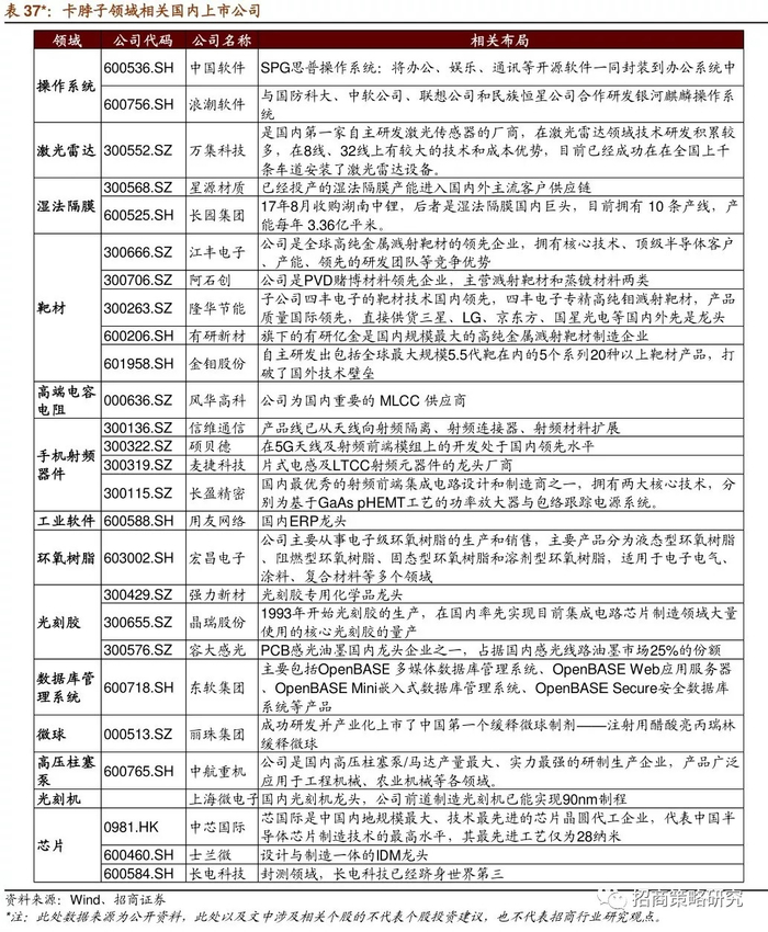 今年六月《科技日报》总编辑刘亚东曾做题为“除了那些核心技术,我们还缺什么”演讲,介绍了中国目前包含光刻机、芯片、操作系统、ITO靶材、光刻胶等在内的35项卡脖子技术,我们对其中部分领域做了一些梳理,以期投资者在相关方向布局有所启发。