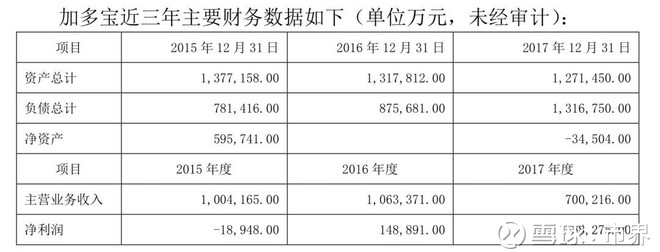 早先,中弘集团发布的加多宝财务数据显示:2015年-2017年,加多宝集团主营业务收入分别为100.42亿元、106.34亿元、70.02亿元;分别实现净利润-1.89亿元、14.89亿元、-5.83亿元。截至2017年12月31日,加多宝资产总计127.15亿元,负债131.68亿元,净资产-3.5亿元,已经资不抵债。