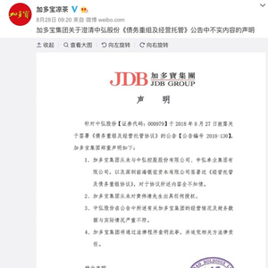8月27日晚上,A股“老油条”中弘股份刚宣布和加多宝的“盟友”关系,称加多宝将对中弘进行债务重组。8月28日一早,加多宝立马“打脸”,急匆匆发布声明,和中弘股份撇开关系。