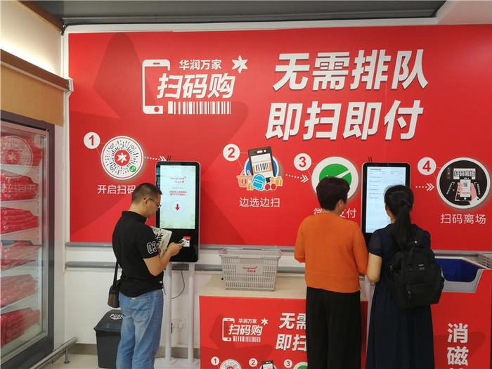 图为华润万家位于深圳布吉百鸽笼门店扫码购物现场。
