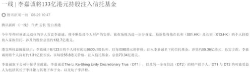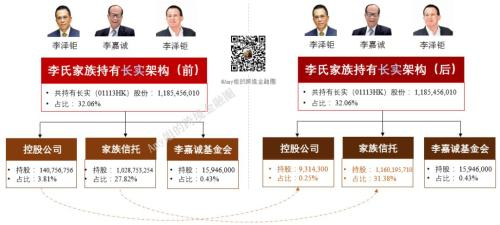 李嘉诚又将其个人名下所持合计133亿股份,转到了家族信托里,转让后,李氏帝国几乎所有资产全部搭乘上了家族信托这个母舰。