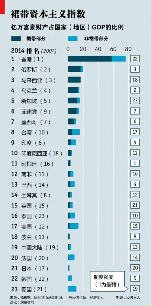 14年3月《经济学人》发布的“全球qun带资本主义指数”称,香港已成为全球qun带资本主义最严重的地方,财富集中度接近80%。