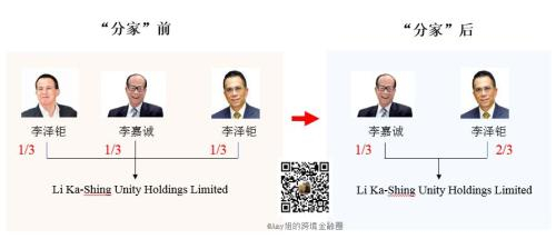 宣布分家后两个月,2012年7月16日,李嘉诚已将本来由其次子李泽楷持有的1/3家族信托权益(即Li Ka-Shing Unity Holdings Limited,是长和系资产的终极持有公司,未“分家”前由李嘉诚三父子各持1/3)全部转让给长子李泽钜,这让李泽钜持股量增至2/3,余下1/3继续由李嘉诚持有。