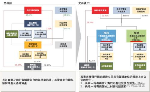 重组简括为:创立两间新的香港上市公司,即长和、长地。长和,将接手原长实及和黄两个集团的所有非房地产业务;长地,将合并两个集团的房地产业务。