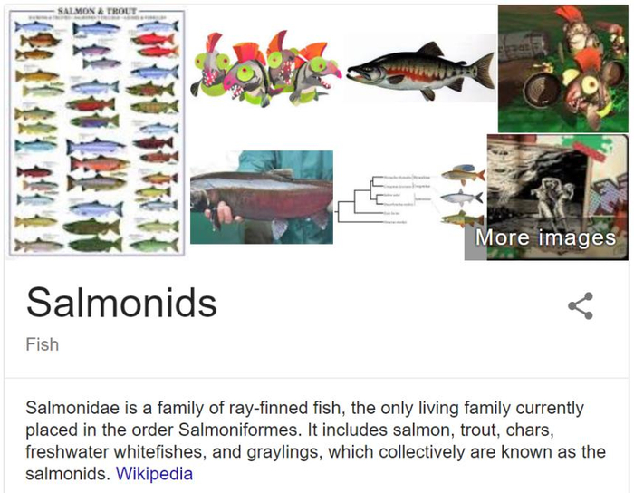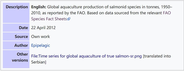 虽然在维基百科Salmon词条下,该图片的说明写的是“salmon species”,salmon一词的使用让人一下无从判断指的究竟是通用说法“三文鱼”,还是生物上的说法“鲑科鱼”的简称,但是只要点击图片,就能看到该图的详细信息和来源。这也正是为什么维基百科团队建议使用者,利用维基百科的引用习惯对内容进行溯源。