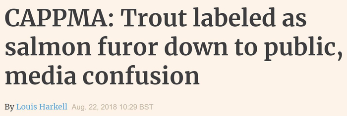 此外,文章还提到“外媒中<Undercurrent News>……给予了澄清,解释了中国这家全球知名水产行业协会标准,外媒搞错了。题为<Trout labeled as salmon furor down to public, media confusion>(虹鳟标示为三文鱼引公众喧闹,媒体混淆了),阐述了欧洲也是将三文鱼作为一个类别的总称”。