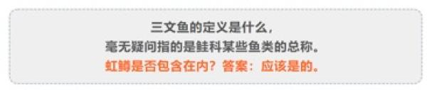 在该文中,作者写到:“三文鱼的定义是什么,毫无疑问指的是鲑科某些鱼类的总称。虹鳟是否包含在内?答案:应该是的”。