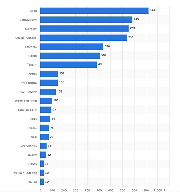 全球最大市(估)值20家互联网企业(2018年5月)。数据来源:The Statista 网站