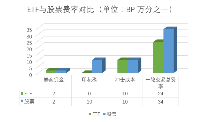 我们知道,在出售股票时我们需要交纳0.1%的印花税,而在出售ETF份额时则不需要缴纳印花税。在佣金成本、冲击成本一样的情况下,ETF买卖一轮的成本明显低于股票买卖一轮的成本。