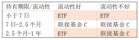 我们以C份额无申购费,持有7天以上无赎回费,销售服务费每年0.2%的标准测算,无论ETF流动性如何,持有期小于7日购买ETF更划算,而持有期在7日到2.5个月之间时ETF联接基金C则更有优势。