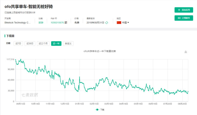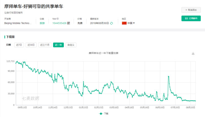 若调取摩拜单车的数据来看,自去年中起,摩拜单车的下载量便一直处于下降趋势。但值得注意的是,在哈罗单车爆发的3月,也只能和摩拜的当日下载量几乎持平。而在7月摩拜宣布全国免押金之后,也在短期内获得了一波快速提升,日下载量将近8万,同样也未能维持长久。ofo则大势难改。
