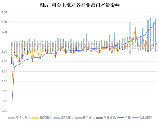 具体行业部门来看(图5),租金上涨让消费、劳动力、租赁投入占比较大的行业如休闲业产量下跌显著,居民用于此类行业部门的消费也将会下跌。其他服务行业如电信服务业、保险业、贸易零售(含餐饮)产量下降幅度也排在前列。租金成本上升将导致价格上涨,而这一部分成本也直接转接到消费者身上,导致需求减少,产量也随之下降。因此租金上涨对消费、服务行业的负面影响在预料之中。 但是值得注意的是,尽管租金成本上升将有可能导致劳动力成本上升,部分劳动力密集型产业也将受到这一因素影响,但我国出口导向行业如纺织品、皮革制品、电子产品等部门却能在租金成本上升情况下保持产量轻微增长。尽管受制于不断下降的国内需求,这些出口受惠部门却能将国内的过量产能直接转移至外部市场,而不受租金成本、劳动成本上升等因素的牵制。此外,出口导向行业的上下游行业产出也将受益于出口需求增加。