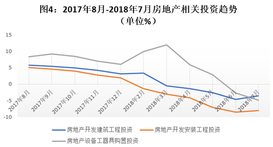 租金上涨除了导致宏观经济总体下行外,对一些具体行业冲击尤甚。笔者根据CGE模型模拟租赁行业租金上涨10%对国民经济56个部门行业的影响,结果发现租金上涨对绝大部分行业都带来了负面影响。其中冲击最大的是建筑部门,国内需求及总产出值下降近3%,劳动力就业率下降达3.56%。与建筑行业相关的上下游产业如机械设备、钢铁、保险、金融服务等行业国内需求和总产出值都有较大幅度下滑,租金上涨对建筑部门产业链的负面影响较为明显。由于建筑业是投资驱动型产业,租金暴涨将打击相关行业部门投资积极性,而这也正验证了此前我们对宏观经济指标的分析预测。事实上,在现阶段房地产投资下行已初现端倪。根据国家统计局数据,从2017年8月至2018年7月间,房地产相关投资包括开发建筑工程投资、开发安装工程投资和设备工器具购置投资均呈现下滑趋势,近几个月甚至出现了负增长(图4)。