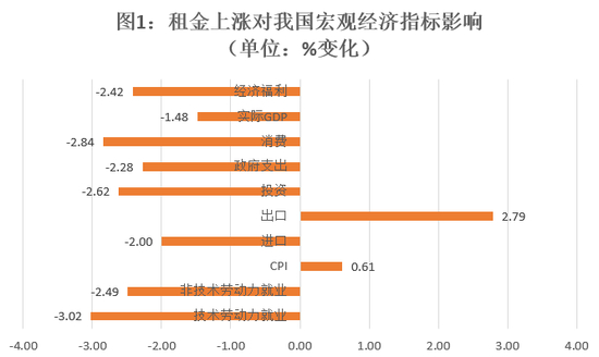 据统计,在中国一些一线城市房地产市场租售比高达1:700,远超国际警绒线1:300通行标准。这意味着一些城市房产购买者需要700个月房租收入才可实现房产成本回收,房地产市场严重泡沫化。据中国社会科学院发布的研究报告,中国家庭住房自有率高达93.5%。但这主要是因为我国大量农村人口拥有住宅地,拉高了住房自有率。实际上,随着中国城镇化加速,大量农村人口向城市转移,这部分人口却因无法承担城市的高额房价而转向租房市场。根据国家卫生计生委《中国流动人口发展报告》统计,流动人口在居住地购房的比例仅占8.6%,而选择租房的比例高达67.3%。此外再加上国内公共租赁住房制度的缺位,房租暴涨必然对城市主要劳动力带来较大的冲击,而这一部分冲击也将会传导至国民经济的生产与消费中。为了模拟这一影响结果,我们假设房租上涨导致整体租赁行业成本上升10%,房租增加也将会导致居民消费价格指数(CPI)相应上升。假设居民真实工资水平不变,通过CGE经济模型可量化我国宏观经济与产业经济投入产出数据,同时在数据基础上也可为相关政策的制定提供决策依据。
