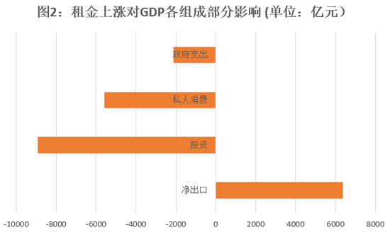 再具体分析GDP各组成部分的变化(图2),租赁成本增加影响最大的将是投资部门。由于投资部门在国民生产总值中占比较大,投资部门价值及数量下降最终将导致实际GDP下滑。其次,租金上涨也将会挤压私人消费及政府支出。由于国内消费减少,国内产品将积极寻找外部市场增加出口,这也导致贸易顺差加大。此前媒体评论焦点均聚焦在在租金上涨对居民消费的负面影响上,但除此之外,租金成本增加而导致投资减少的问题也不容忽视。投资大幅减少最直接的影响将造成经济驱动不足,并对我国经济活力形成冲击。