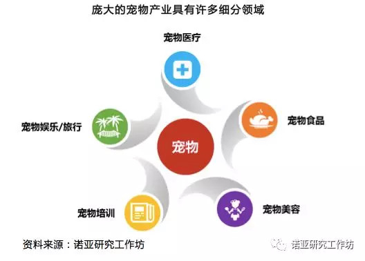 当前的宠物行业,主要分为宠物医疗、宠物食品、宠物美容、宠物培训和宠物休闲/旅游等五大方面,而由此延伸出去的,还有宠物保险等与其他相关行业和领域相结合的细分行业和产品。