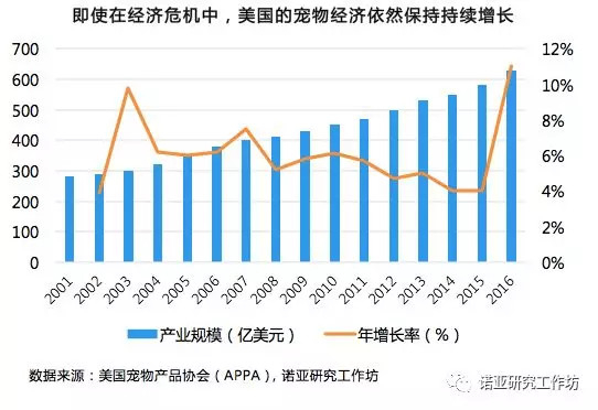据APPA(美国宠物产品协会)的调查数据显示,目前在宠物产业最发达的美国, 68%的家庭至少拥有一只宠物,同时宠物产业的总体规模也呈现逐年上升的态势, 于2016年达到了668亿美元。