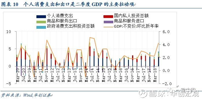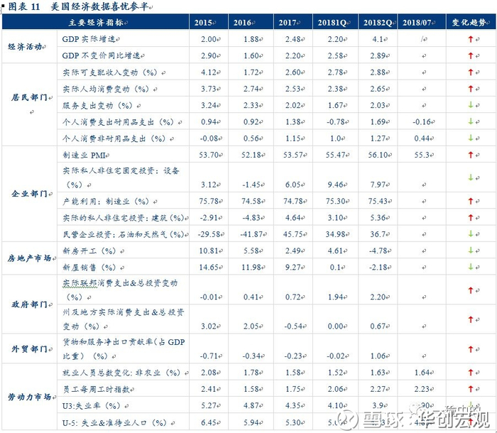 从近期公布的美国数据来看,美国已经从2015年经济数据的全面向好转到目前的喜忧参半。虽然二季度实际GDP环比折年率向上修正至4.2%,但在加息影响下,利率敏感型支出,如耐用品消费支出(汽车销售增速)、房地产投资(住宅投资、新开工、房屋销售增速有所放缓)增速开始放缓。具体来看,美国2季度GDP的高增速也不具有持续性。一方面,出口对二季度GDP环比折年增速拉动了1.1个百分点,远远偏离了其历史平均,后续在中美贸易摩擦下有较大不确定性。另外,美国二季度国内投资支出的拉动率从1.7%下行至0.1%,企业投资支出的前瞻指标PMI、PMI新订单以及费城联储资本支出预期在二季度均有所下跌。 最后,由于统计方法的原因,GDP环比折年率数据在经济扩张期容易放大经济增速(与同比和环比增速不同,环比折年率的假设前提是全年均保持本季度增长的幅度),与此同时美国2季度GDP不变价同比增速并未大幅上升。
