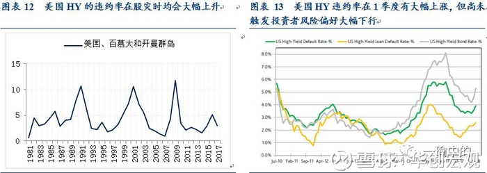 思辨2:利率曲线倒挂领先股市拐点的规律这次会不一样吗?核心是风险偏好的变化程度。美国高收益债违约率可侧面作为衡量市场风险偏好的指标(2000年和2007年股灾,高收益债违约率大幅上升)。2018年1季度高收益债的违约率已经有明显抬升,虽然尚不够危机高位,但表明风险偏好存在走低的趋势。