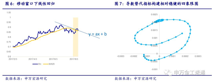 由于股票指数为离散点位,不具备连续可导条件,因此我们使用移动窗口内线性回归的方法,对导数进行替代。在对原始相对强弱曲线取移动平均过滤之后,再做移动窗口内的一次方程拟合,拟合后直线斜率a可作为一阶导数替代指标,对a再做一次拟合,即可得到二阶导数替代指标,依此来判断相对强弱曲线状态。